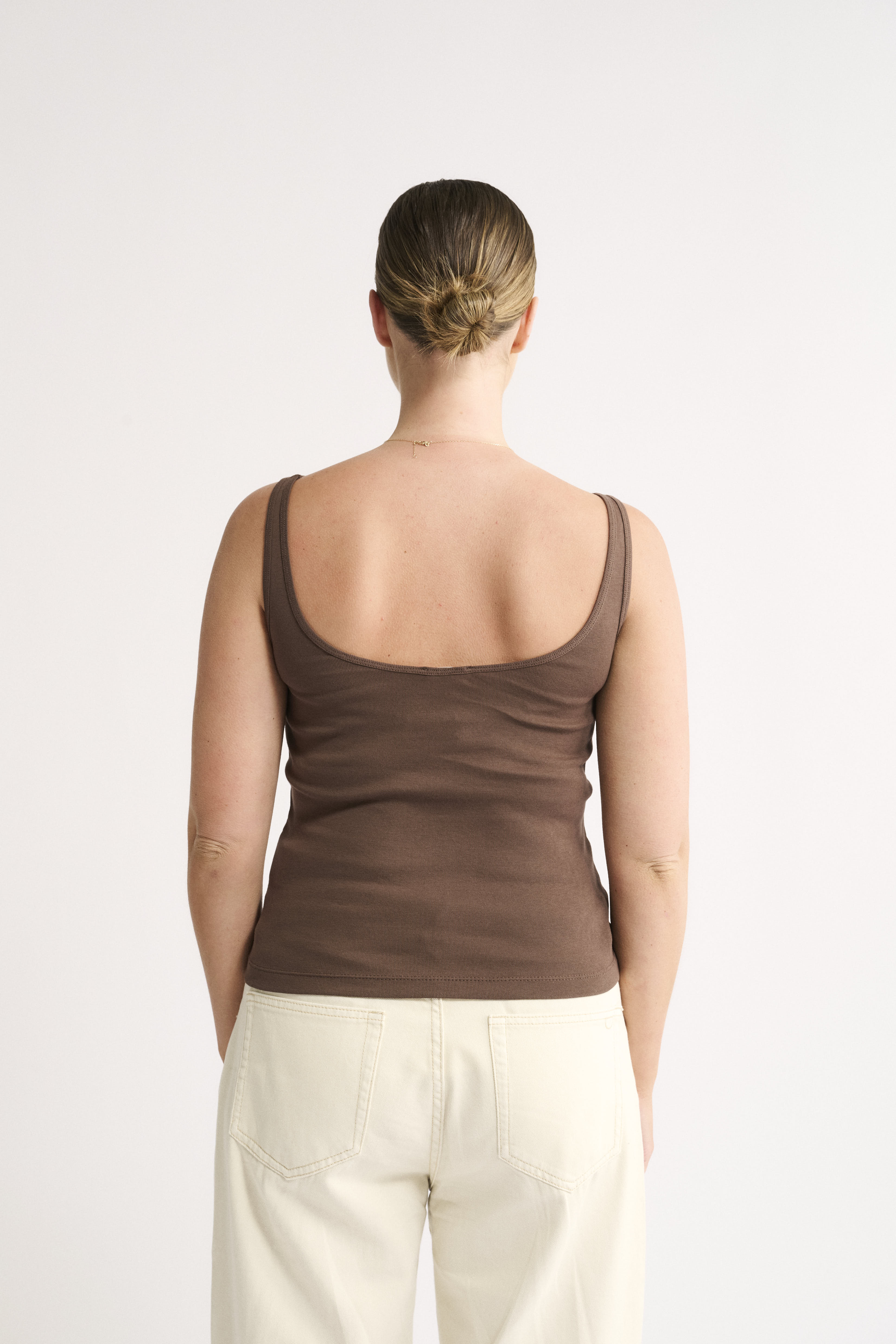 The lightweight fabrication gives the silhouette its relaxed drape and simple wearability. Cut with a gentle scoop neckline and finished with dainty straps, the Chestnut colourway adds a warm, earthy tone to this minimal everyday staple.