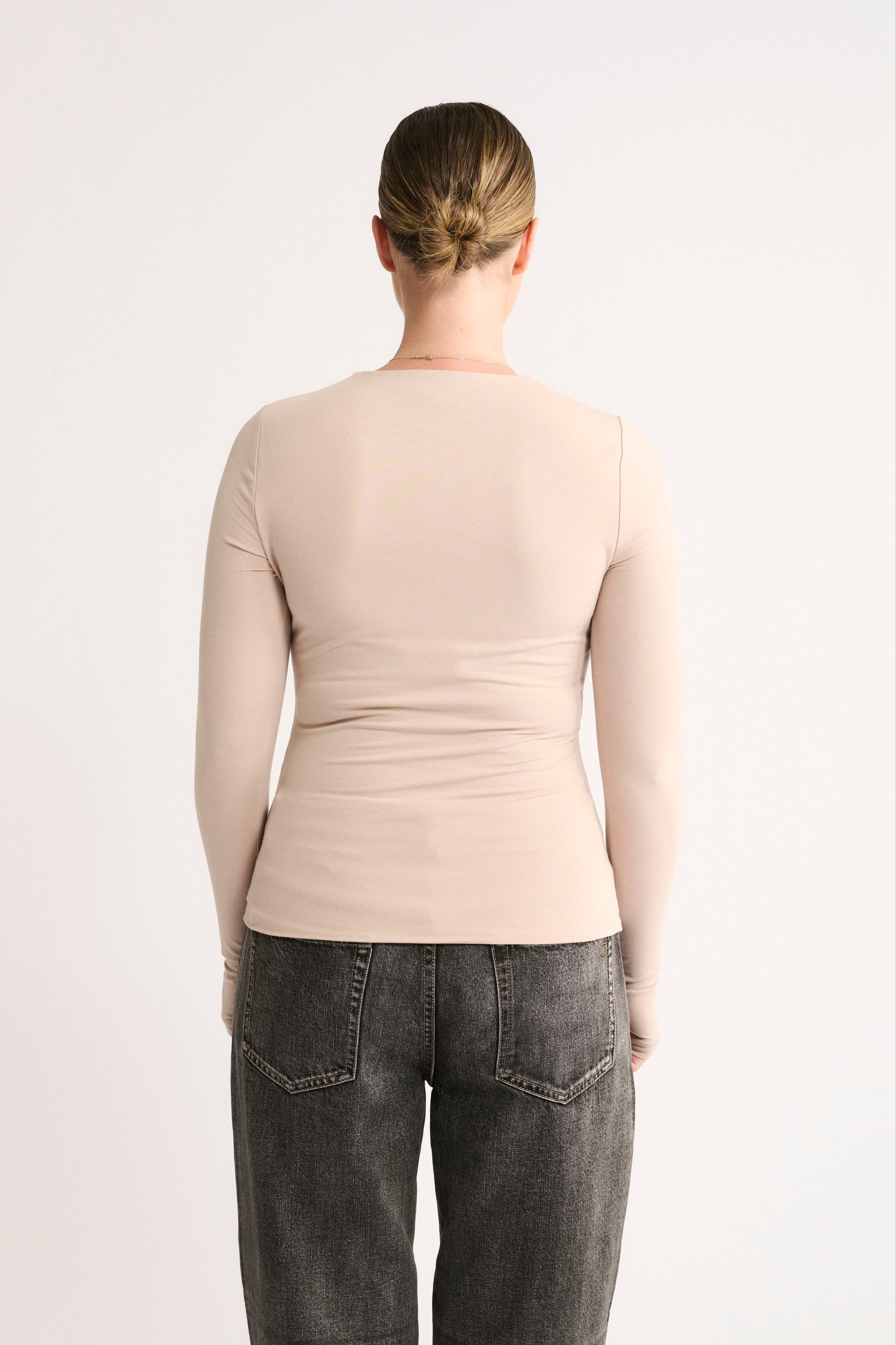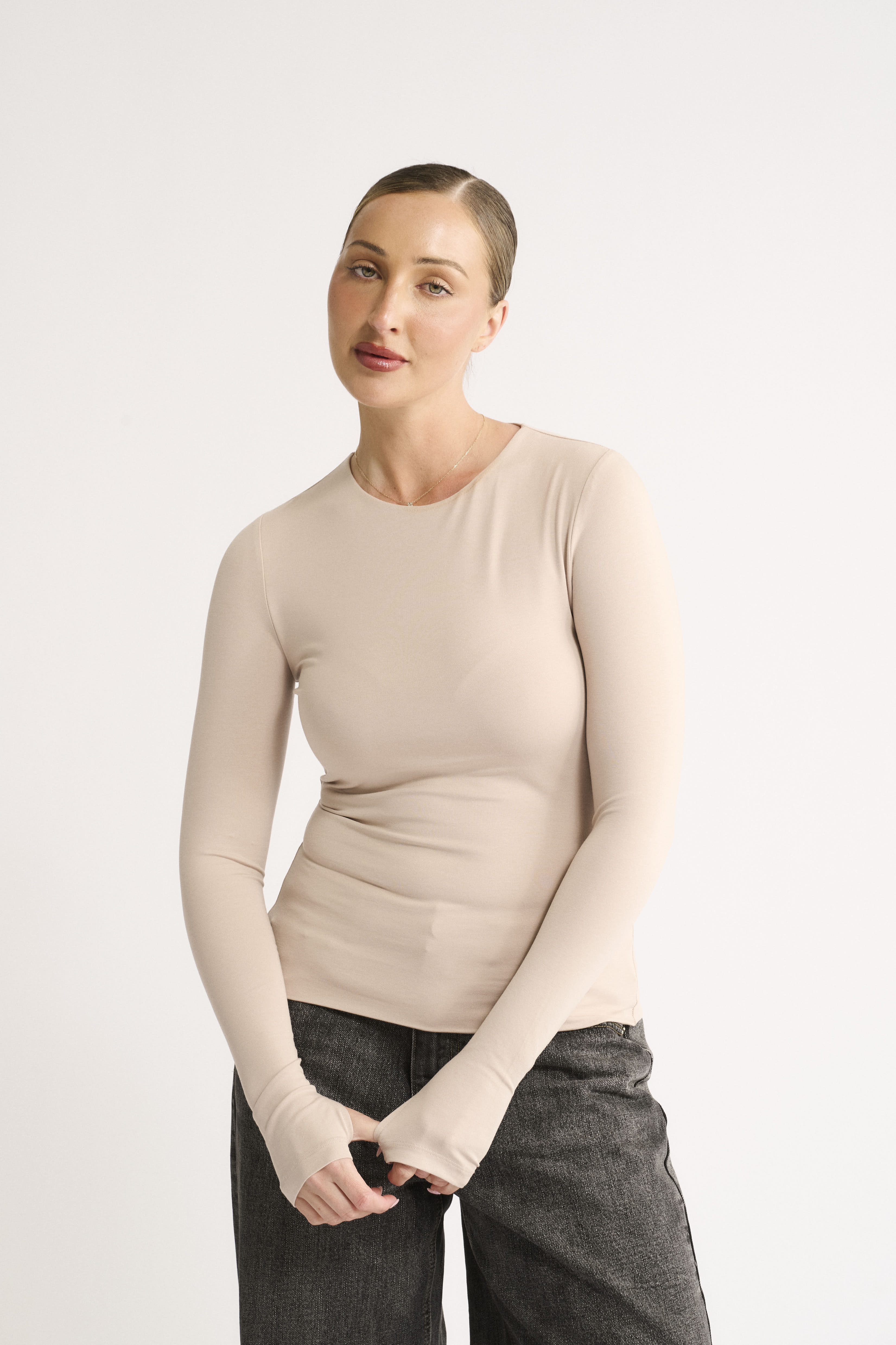 With a classic crew neckline, full-length sleeves with subtle thumbholes, and a seamless hem, the Jenna Long Sleeve offers a clean, elevated finish. Double-layered for light support and coverage, it’s cut long for styling your way - tuck it in, ruche it at the waist, or wear it loose.