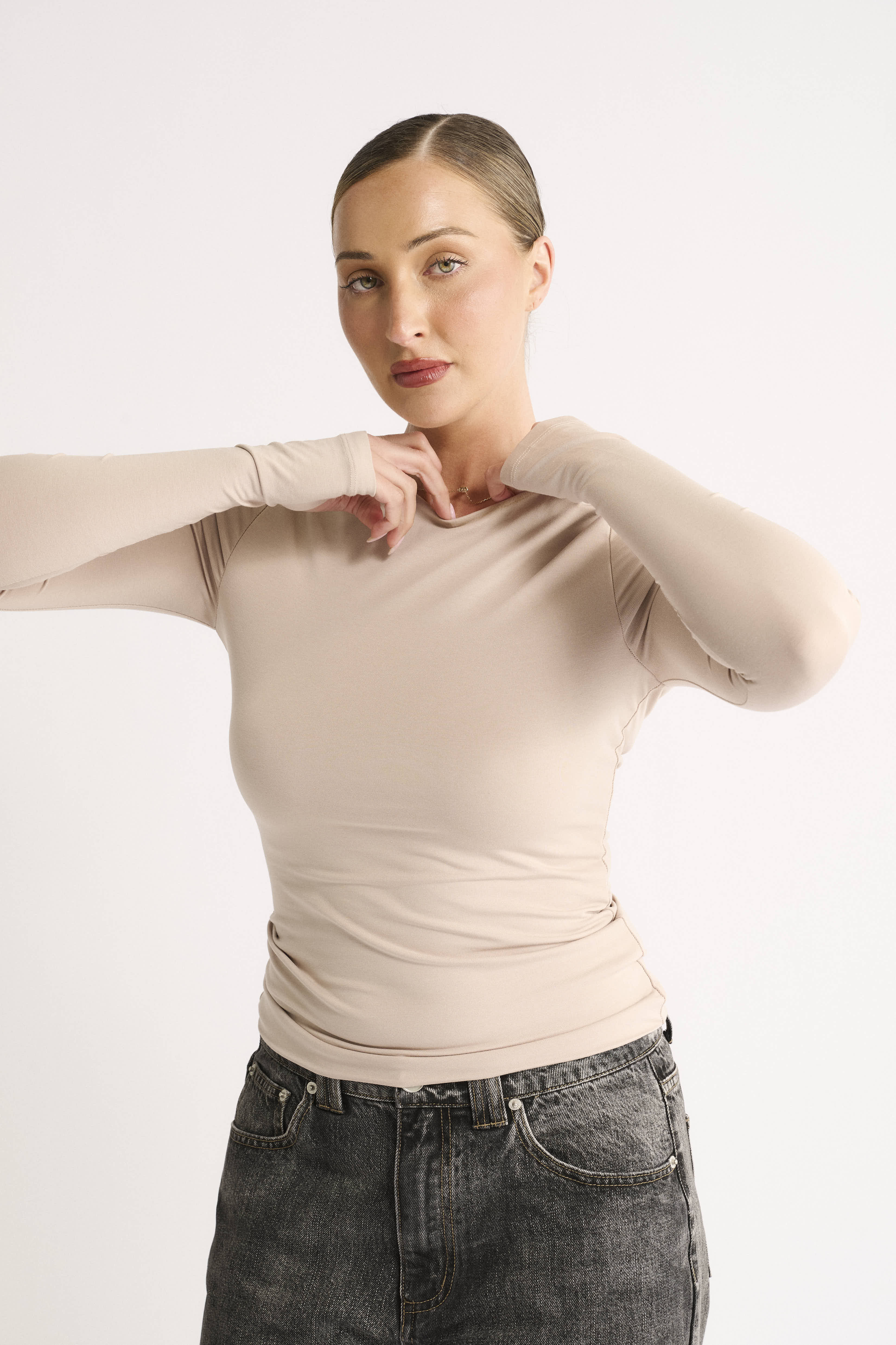 A timeless neutral for every wardrobe, the Jenna Crew Neck Long Sleeve Top in Chai is the perfect layering piece. Made from our best-selling Ultra Soft Jersey, a premium cotton/modal blend that’s breathable, stretchy, and smoothing.