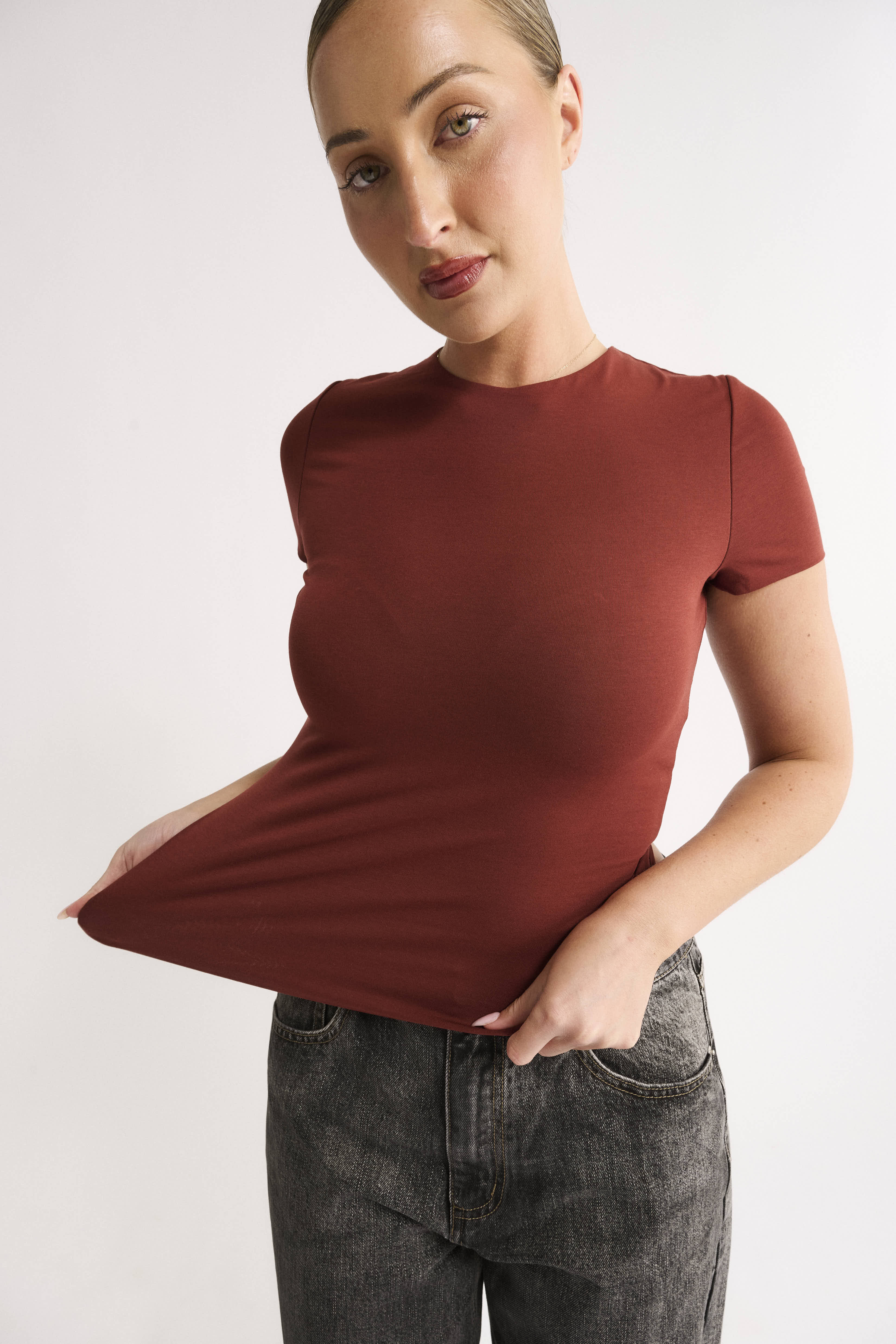 The Jenna Crew Neck T-Shirt in Brick brings warmth and depth to your everyday edit. A bestselling shape, it’s loved for its clean, classic silhouette. Double-layered through the body for coverage with a smooth, flattering finish.