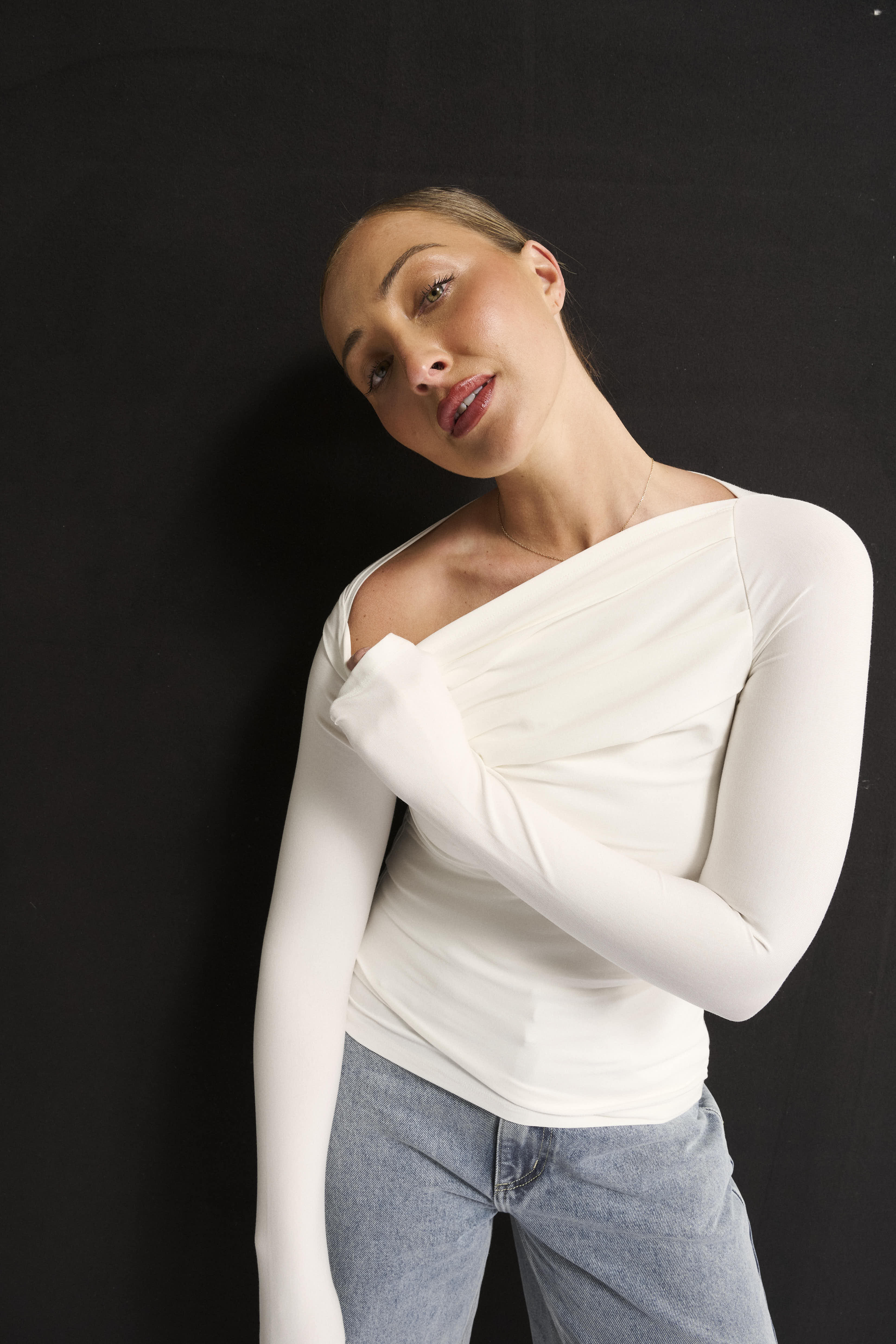 The Margot Boat Neck Long Sleeve Top in Powder is cut from a soft cotton/modal jersey that feels smooth and breathable against the skin. Designed with a double-layered front and gathered waist detail, it creates gentle shape with a smooth, flattering finish. A boat neckline frames the collarbone, and the longer length through the body makes it simple to style with denim, tailoring, or layered under outerwear.
