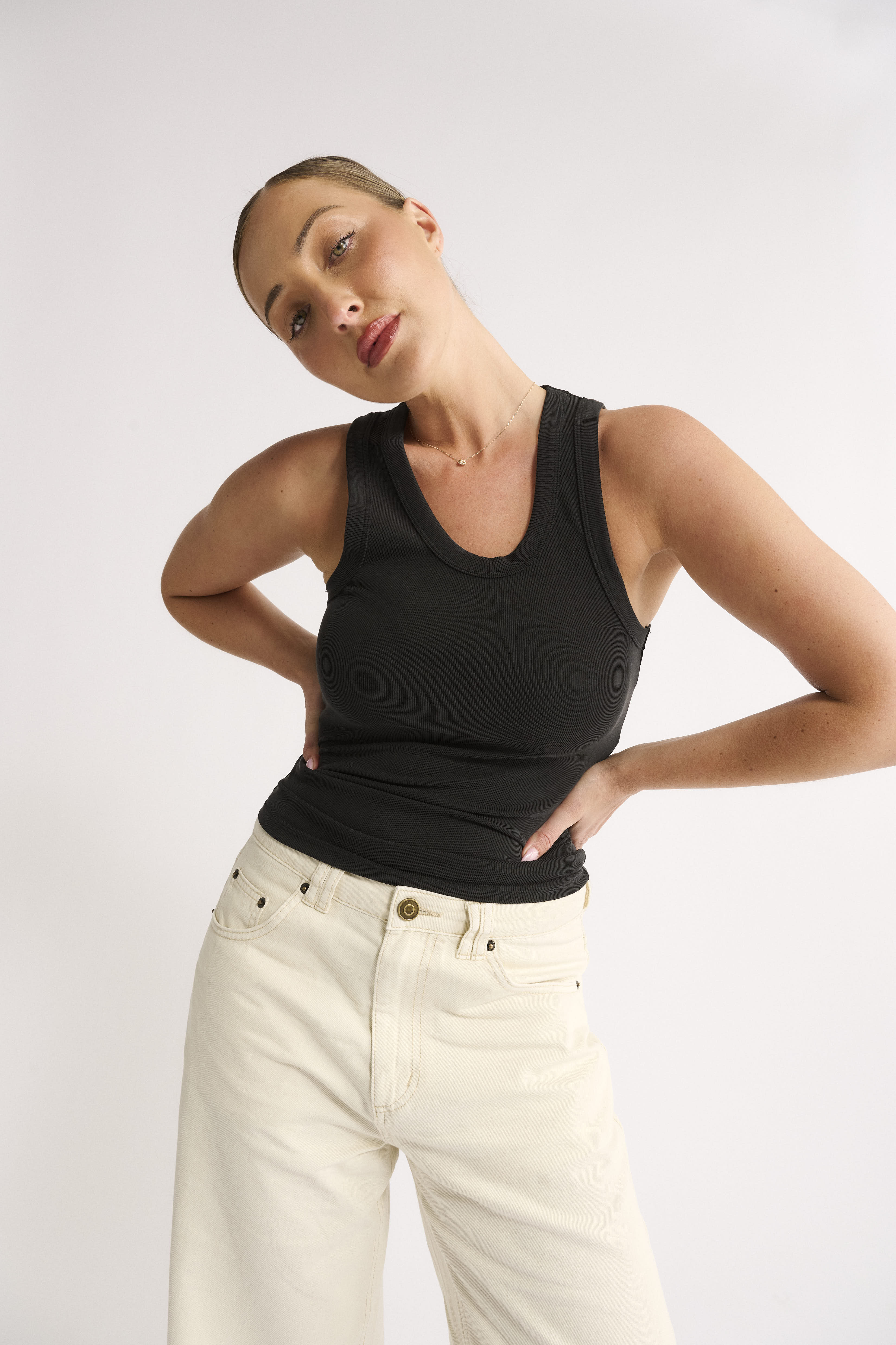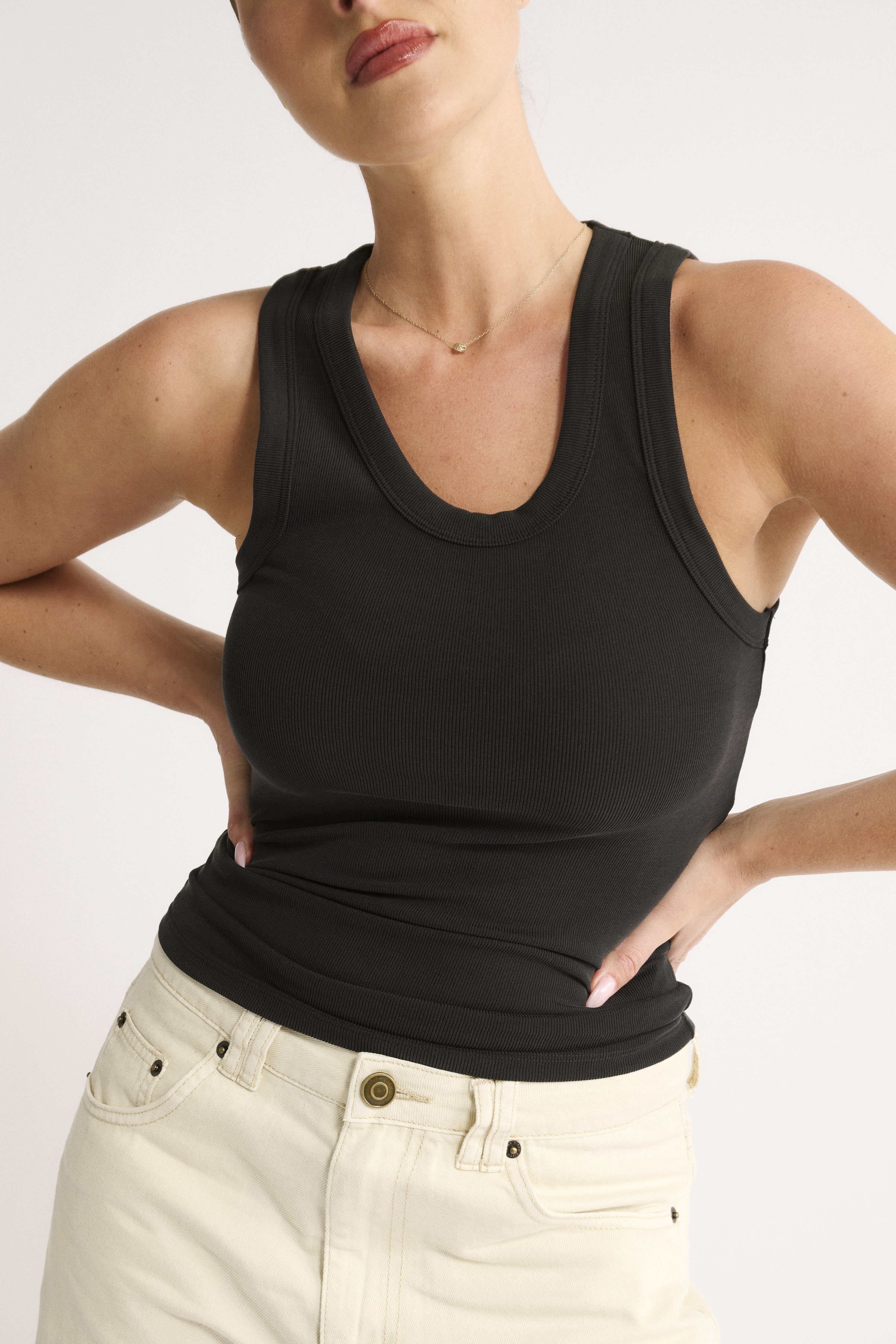 Primi’s Noelle Racer Tank in Washed Black is a stylish essential designed for comfort and everyday versatility.